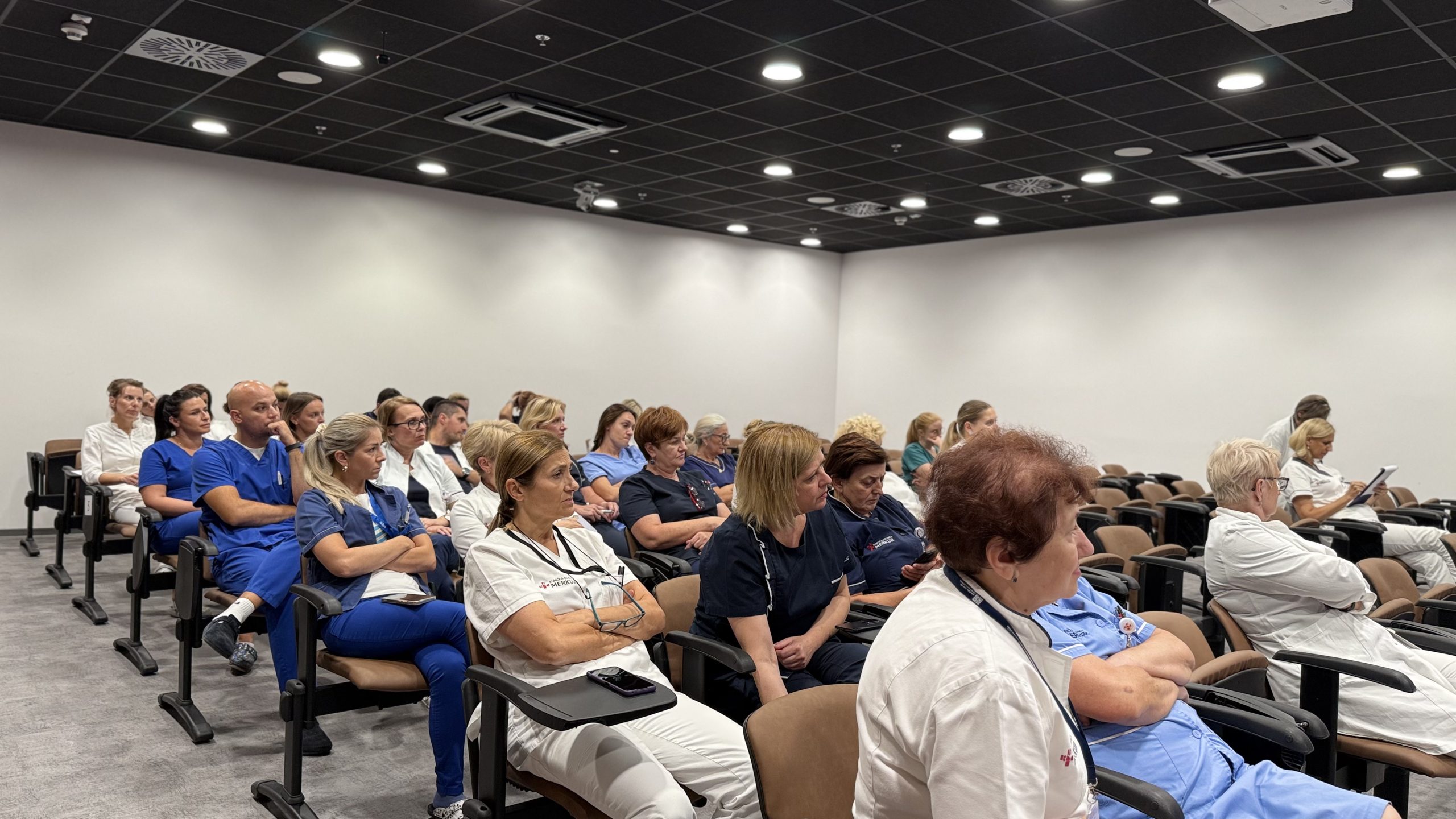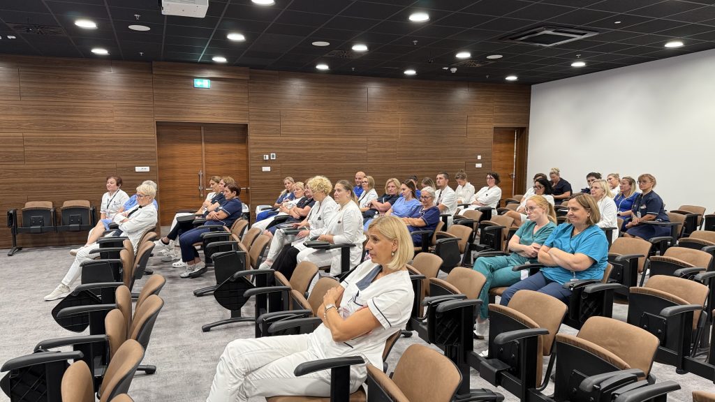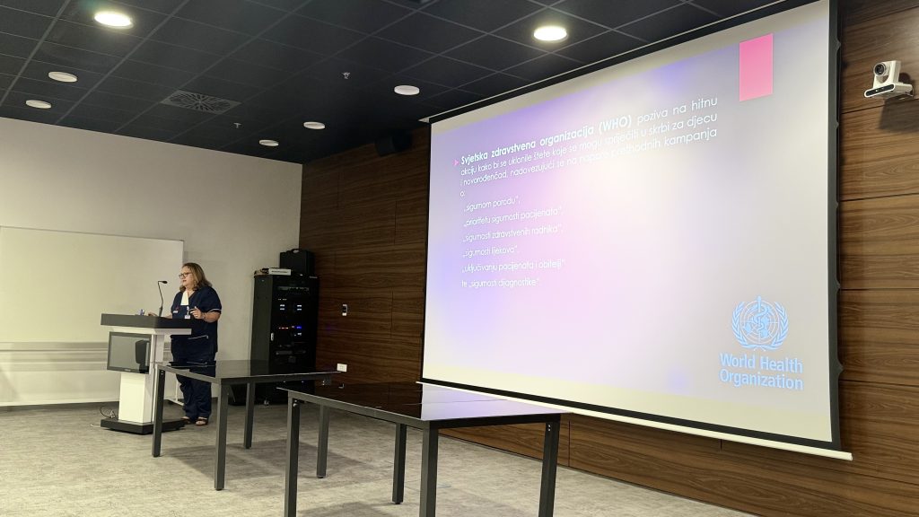 Glavna sestra Klinike za ženske bolesti i porode Jasna Samaržija, magistra sestrinstva održala je izvrsno predavanje na temu “Siguran početak života je pravo, a ne povlastica” u kontekstu teme koju je u 2025. godini odabrala Svjetska zdravstvena organizacija pod sloganom “Sigurnost pacijenta od samog početka”. Istaknula je da posebnu pažnju treba posvetiti važnosti stručne, sigurne i empatične skrbi u trudnoći, porodu i ranom neonatalnom razdoblju. Sigurnost majke i djeteta tijekom poroda ovisi o kvalitetnoj pripremi trudnice, te profesionalnom i humanom pristupu primalja i liječnika. Edukacija trudnica, pohađanje trudničkih tečajeva i aktivno uključivanje u skrb povećavaju sigurnost i smanjuju rizike za majku i dijete. Istaknula je važnost standardiziranih postupaka i edukacije osoblja. Važan doprinos sigurnosti rodilja i novorođenčadi daju rodilišta koja ispunjavaju međunarodno priznate standarde kvalitete, te nose titulu „Rodilište – prijatelj djece“ i certificirana su od strane UNICEF-a i WHO-a temeljem primjene Deset koraka za uspješno dojenje, poticanja ranog kontakta koža-na-kožu, zajedničkog boravka majke i djeteta, te edukacije osoblja i roditelja. Dodatno, u Hrvatskoj je pokrenut pilot-program „Rodilište – prijatelj majki i djece“, koji dodatno naglašava važnost skrbi prilagođene rodilji , uključujući pravo na izbor položaja pri porodu, prisutnost osobe u pratnji, korištenje metoda ublažavanja boli, te izbjegavanje rutinskih intervencija bez medicinskog opravdanja i pristanka rodilje. Rodilište Kliničke bolnica Merkur nosi navedene titule. Novorođenčad je izrazito ranjiva populacija i zahtijeva standardizirane postupke njege, pravilno rukovanje (baby handling), te sigurnu i nutritivno prilagođenu prehranu, s naglaskom na dojenje. Bolnički prostori moraju biti čisti, organizirani i emocionalno podržavajući za roditelje. Edukacija roditelja u rodilištu ključna je za sigurnu skrb nakon otpusta. Kako svaka žena ima pravo na dostojanstven i siguran porod, tako i svako dijete ima pravo na siguran početak života, uz naglasak na ranim godinama života kao ključnom razdoblju za daljnji razvoj zdravlja, sigurnosti i emocionalne povezanosti djeteta s roditeljima. Sigurnost novorođenčadi i majki počinje edukacijom, povjerenjem i sustavnom podrškom. Primalje, medicinske sestre, liječnici i roditelji zajedno čine zaštitnu mrežu koja omogućuje djetetu najbolji mogući početak života. Na Svjetski dan sigurnosti pacijenata 2025. podsjetili smo se kako svaka žena zaslužuje siguran i dostojanstven porod, tako i svako dijete sigurnu i empatičnu skrb – od prvog udisaja nadalje, kao ulog u zdravu budućnost. Nakon predavanja uslijedila je zanimljiva rasprava.